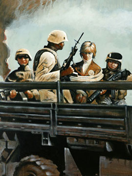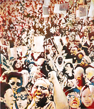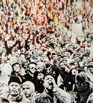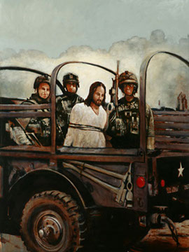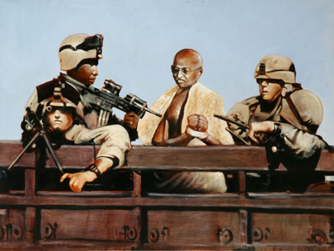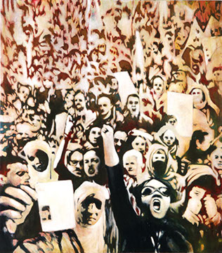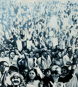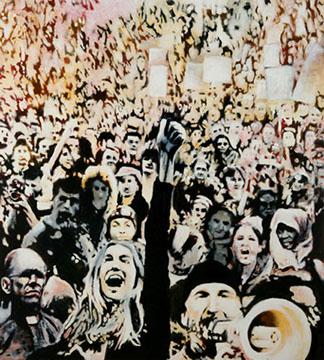 Absence of conscience is a comment on the tendency of “super power” to cull societies of culture forces that present resistance. In the process of this cultural culling the main cultural forces that promote civil rights and equality are threatened. The vision is of significant civil rights leaders being captured and taken away by young under informed soldiers that are most likely unaware of the position or importance of the individuals that they are incarcerating. This form of cultural control has been exercised throughout history most recently in countries such as Argentina, Nicaragua, Chile, Poland, China, and South Africa. As we move deeper into the ‘war on terrorism” we are progressively loosing civil rights and our democratic right for free speech and privacy. In these paintings I am asking the question “how would the present super power react to the historical civil rights activists”. It is important to me to represent a broad range of civil rights activists from the common person on a bus, a film celebrity, an artist to political and religious figures. This cross reference is important because I want to illustrate the fact that the fight for civil rights happens on all levels of society and consequently all levels of society are also threatened by this super power mentality . This inclusive vision of social resistance is also reflected in the images of protest.